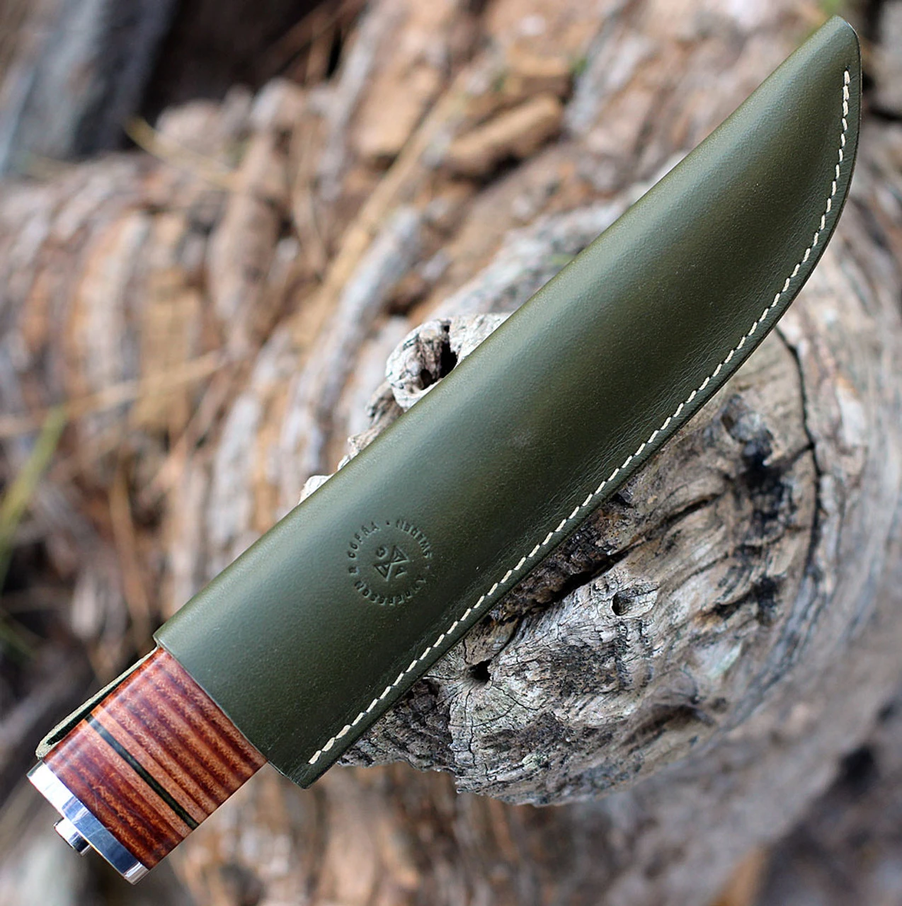 The Scandinavian Sportsman knife No.4 with a stainless steel blade in AEB-L and a stacked leather handle, also including the olive green leather sheath to match the knife.