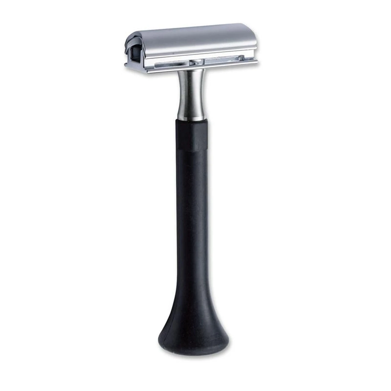 This innovative safety razor offers a 4-edge double blade design and a patented double edge technology. The blades are contoured at a precise angle to deliver a perfect and smooth shave. The razor head is made of solid metal, is chrome plated, and automatically adjusts the blades. The ergonomically designed handle is 4″ long, and is available in a variety of materials. These razors are tested and approved by the National Institute for Cutting Tools and are 100% German manufactured. Each model comes with a set of 10 extra blades. Weight: 3 oz. With moisture resistant silicon handle, black.