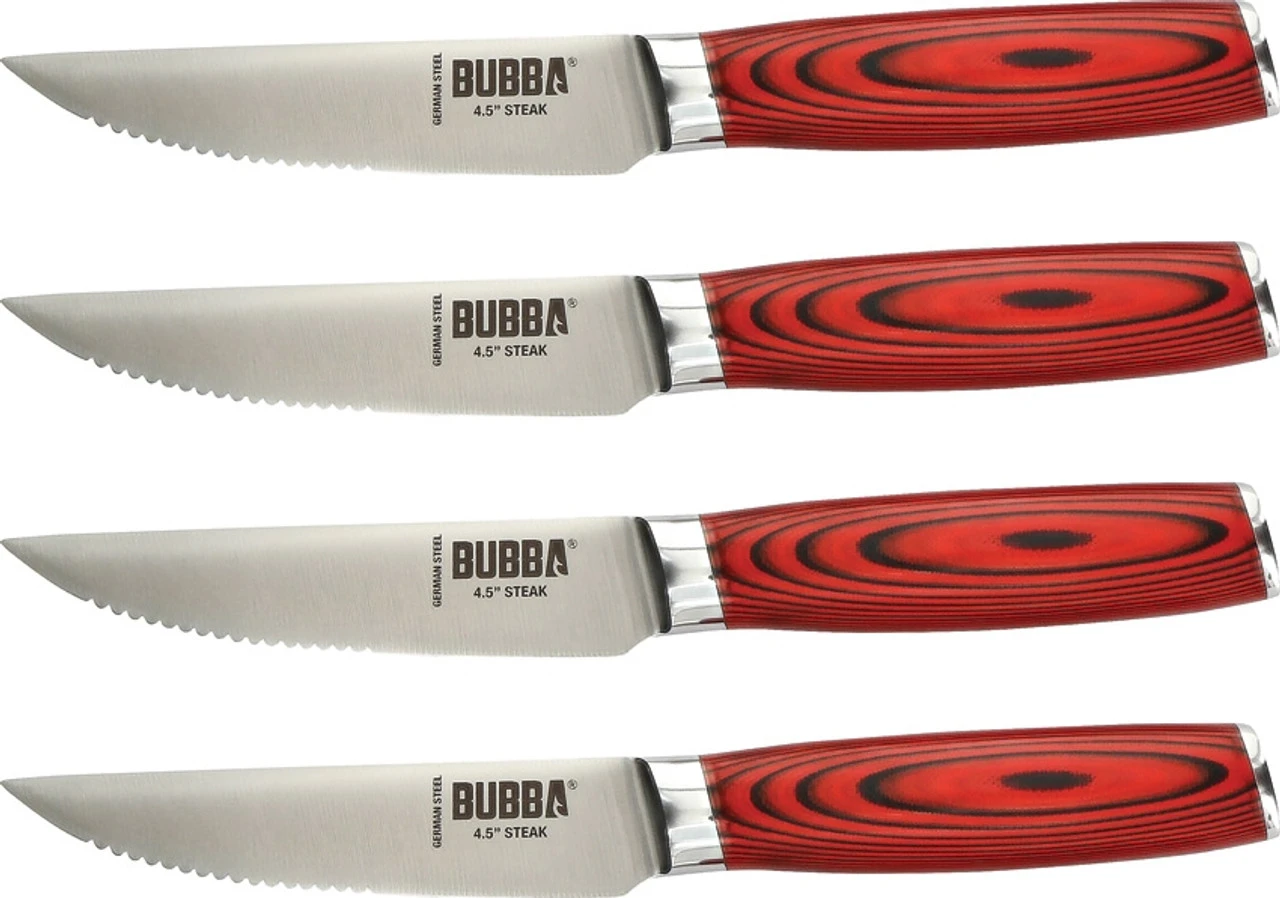 Bubba 4 Piece Steak Knife Set (1137660) – 4.5″ German Stainless Steel Satin Partially Serrated Drop Point Blade, Black and Red G-10 HandleÂ