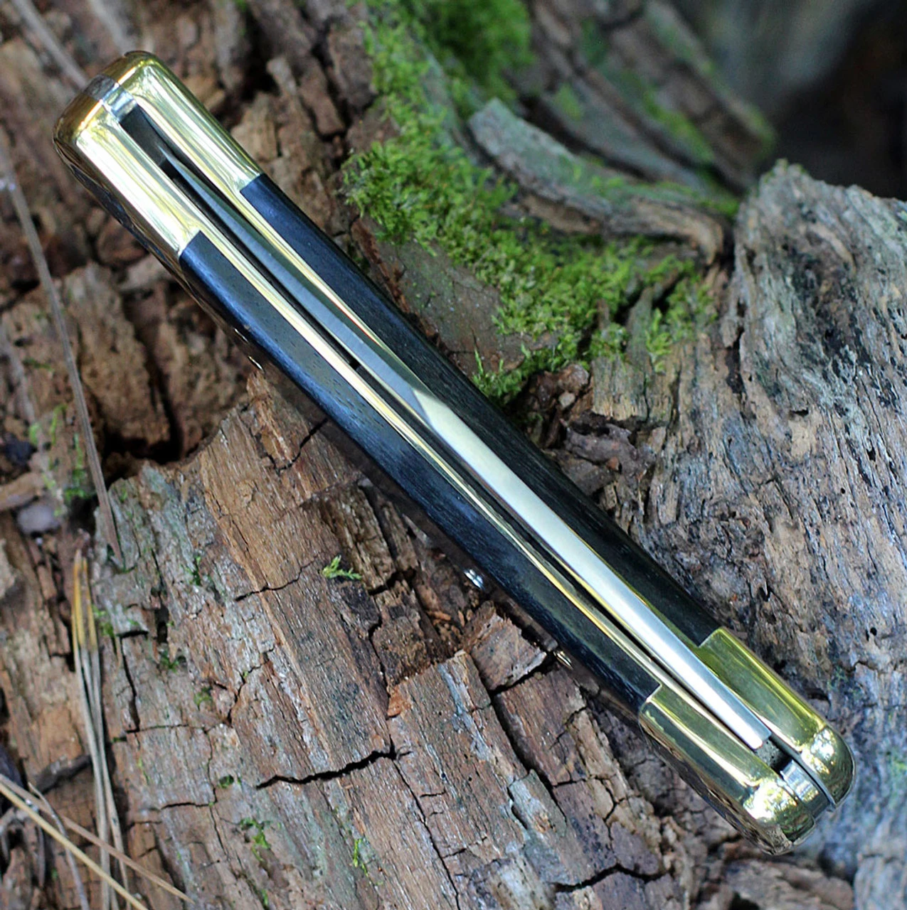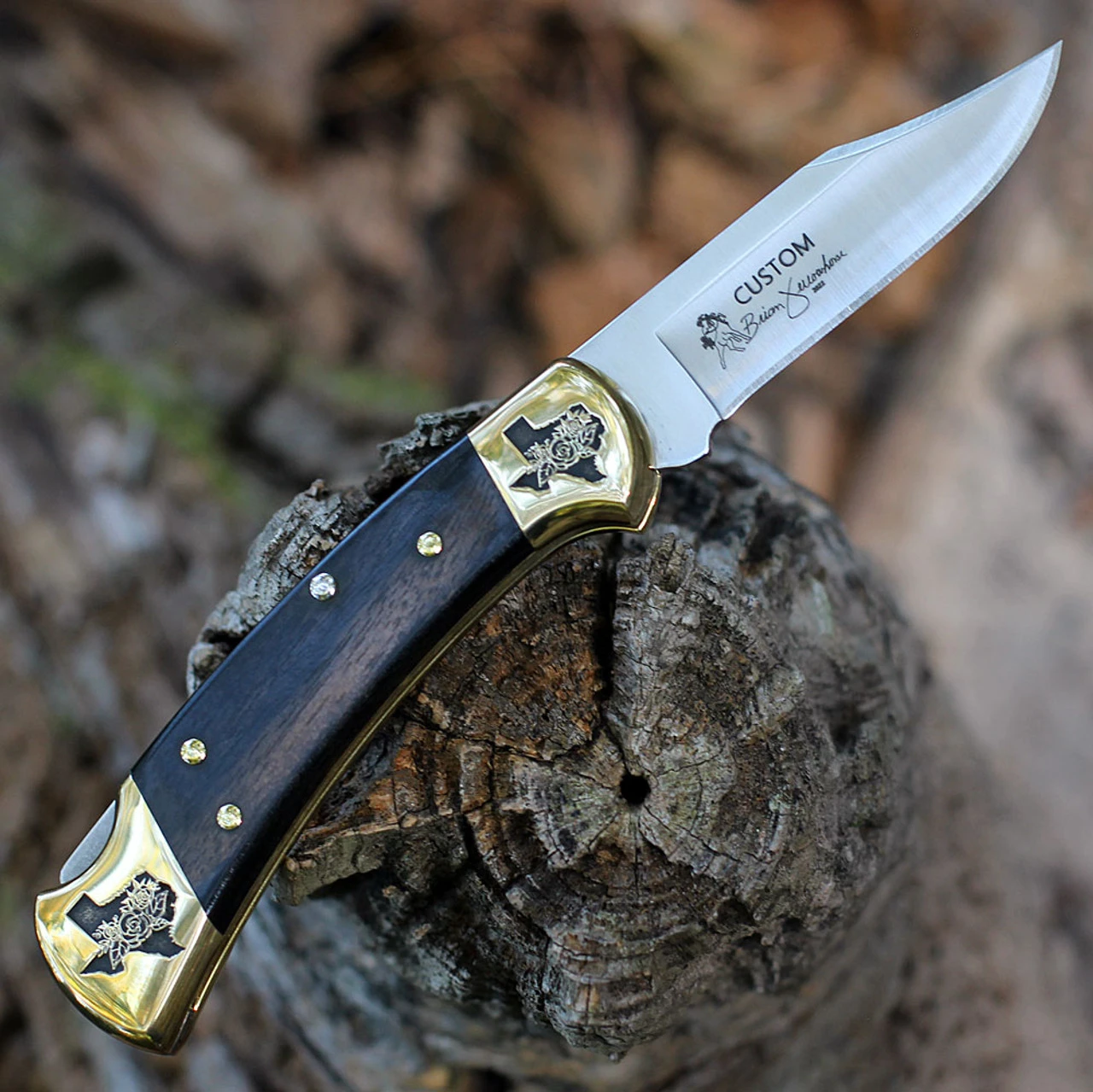 Brian Yellowhorse Custom Buck 110 Texas Rose (YH391-1) 3.75″ Satin 420HC Stainless Steel Clip Point Blade w/ Texas Rose Etching, Ebony Wood Handle w/ Etched Brass Bolsters