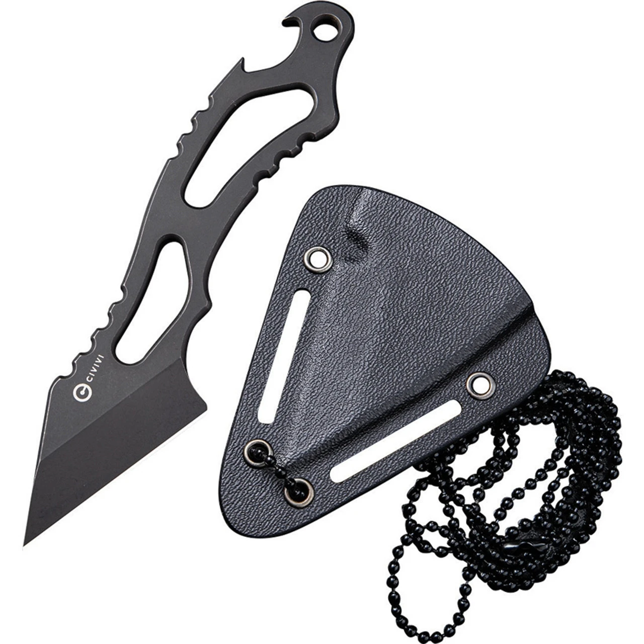 - Includes a Kydex sheath and a stainless steel ball chain.