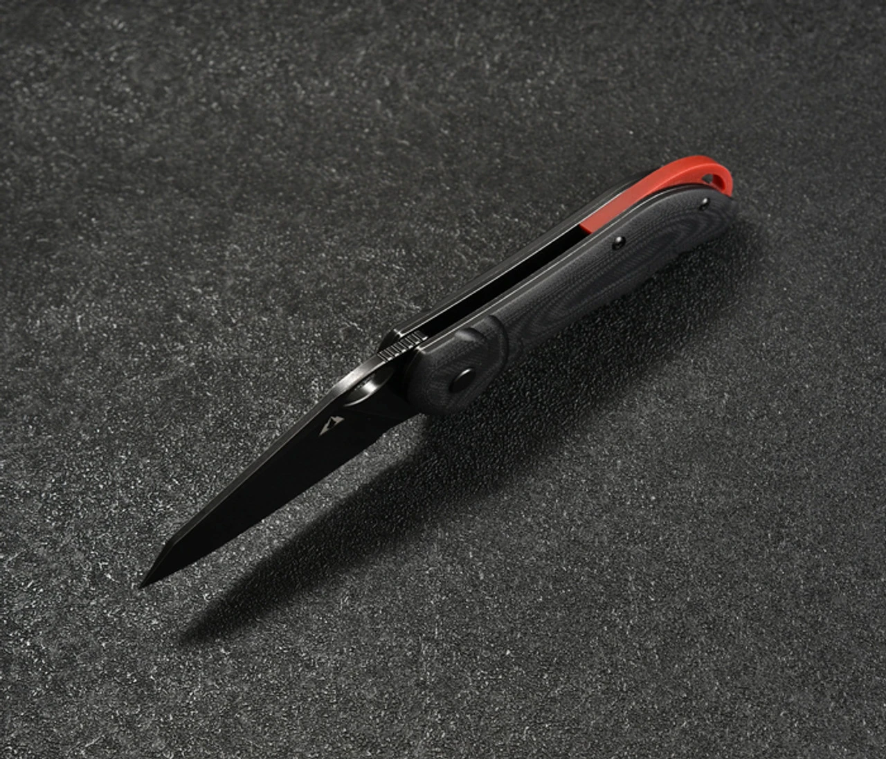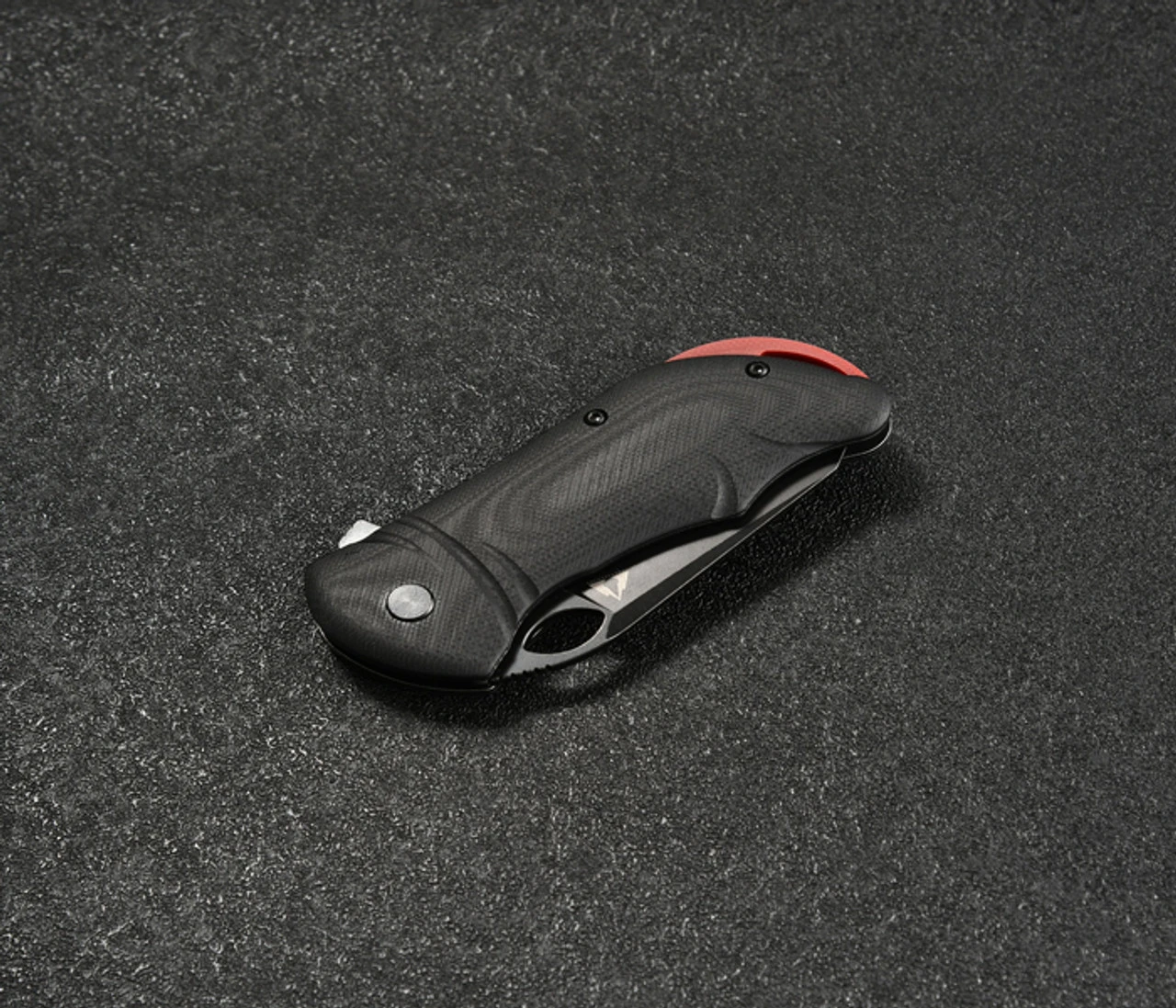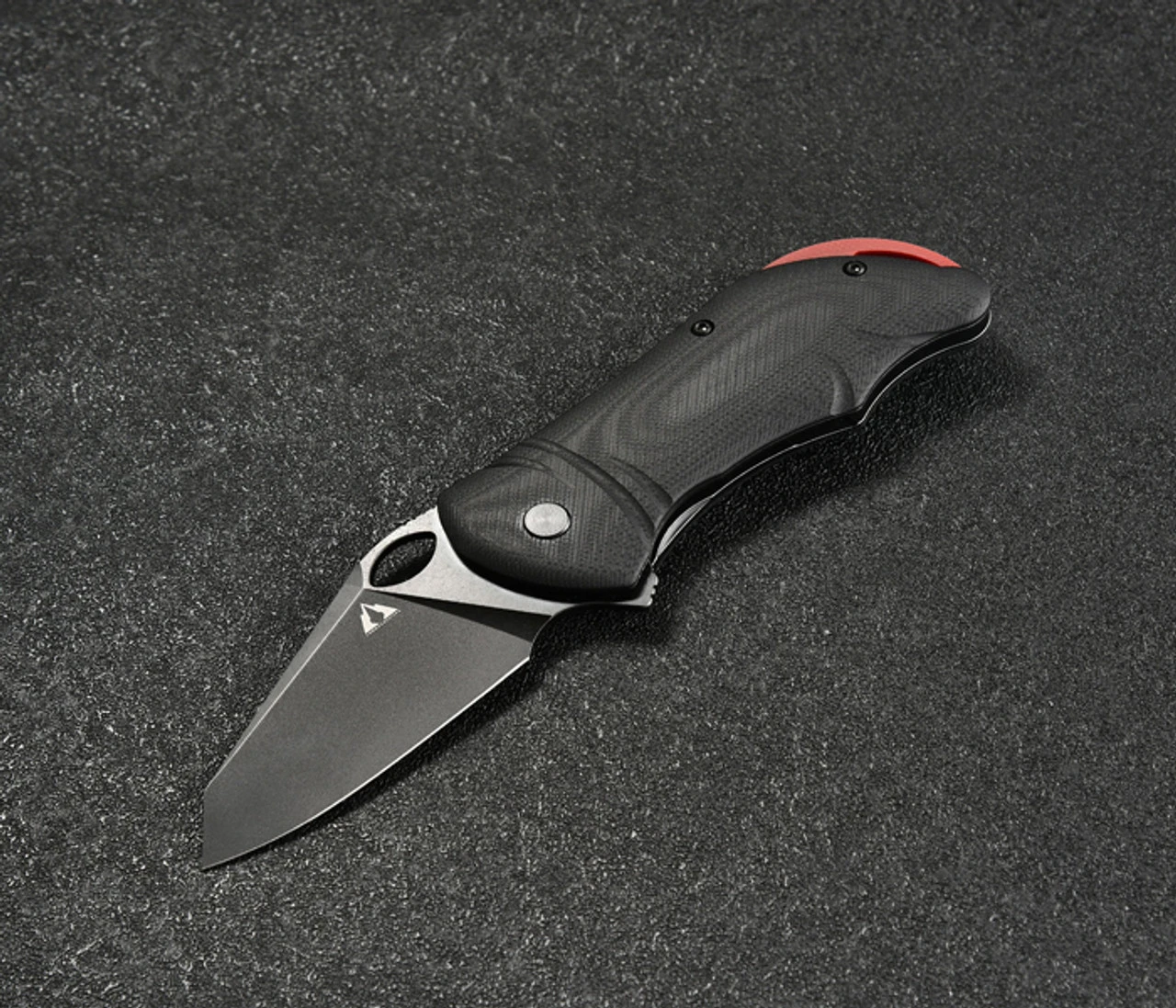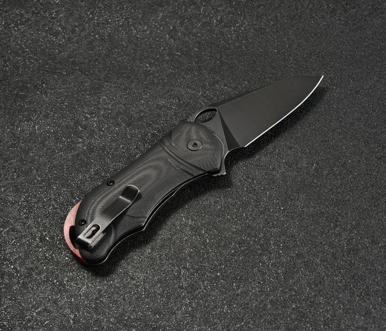 - Black-finished D2 steel blade in a modified reverse tanto style.