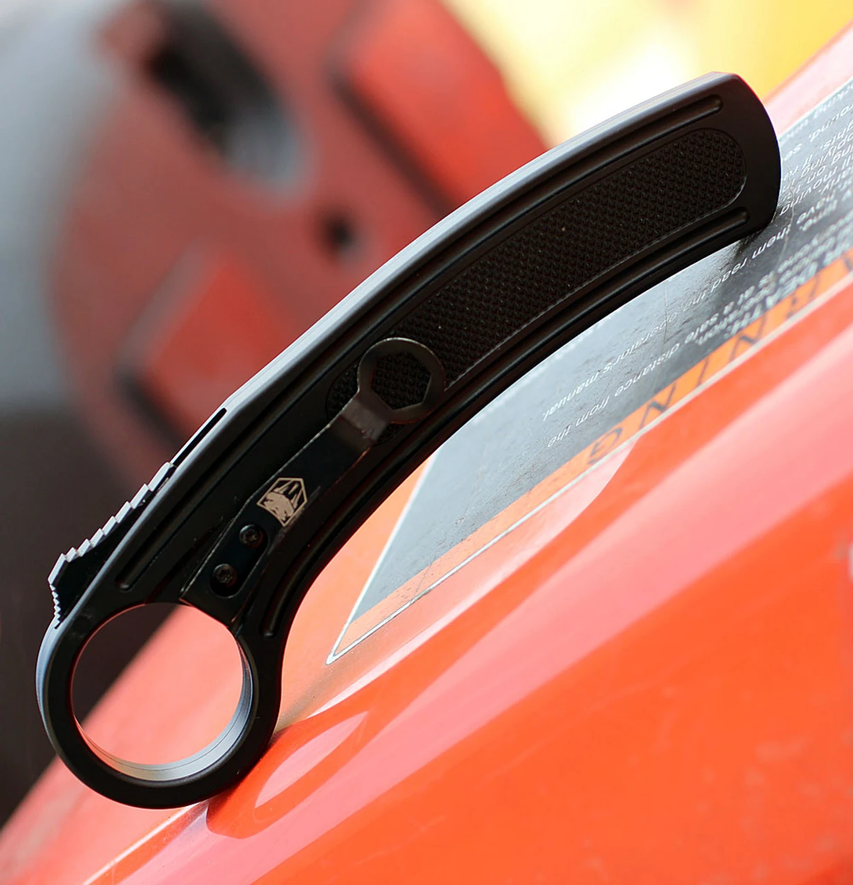 CobraTec Knives introduces THE new Karambit Black. This knife starts with a High-Quality CNC Machined T6061 Aircraft Aluminum handle with a D2 Stonewash steel blade.