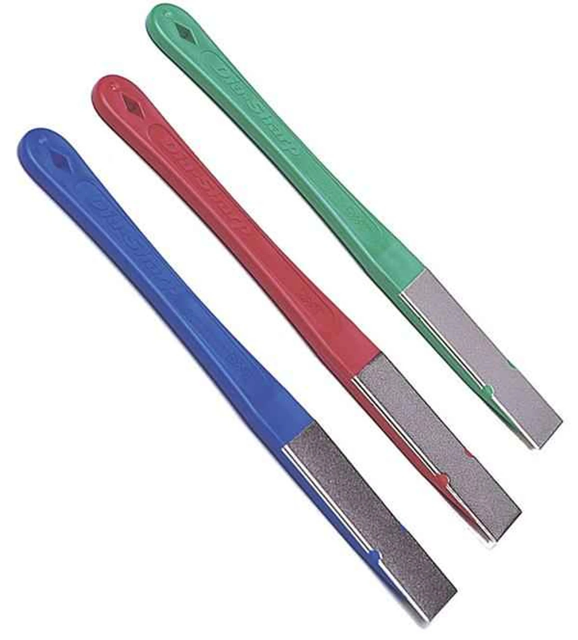 Tight spaceno worries! Kit of Dia-Sharp, 2.5 Diamond Mini-Hone, sharpener with its ergonomically designed handle provides comfortable sharpening, deburring and honing in tight spaces. Easy access tip measures .033 thick. Diamond surface measures 2.5″ x .75″. Kit of 3: Coarse (45 micron / 325 mesh) to quickly restore a neglected edge; Fine (25 micron / 600 mesh) for a razor sharp edge; and Extra-Fine (9 micron / 1200 mesh) to polish and refine a razor edge after sharpening with a coarser diamond. Sharpening with diamonds is fast and easy. No messy oils neededsharpen dry or with water. Durable construction will provide years of consistent performance and reliable service For proper tool maintenance, woodworkers, chefs and other professionals rely on the superior quality and versatility of DMT, products. Made in USA.